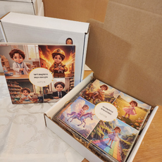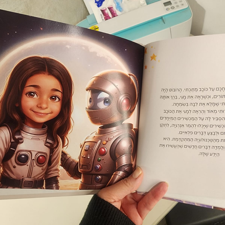 הסיפור והאיורים כבר מעוצבים, ואני מתאימה את הדמות והשמות שלכם.